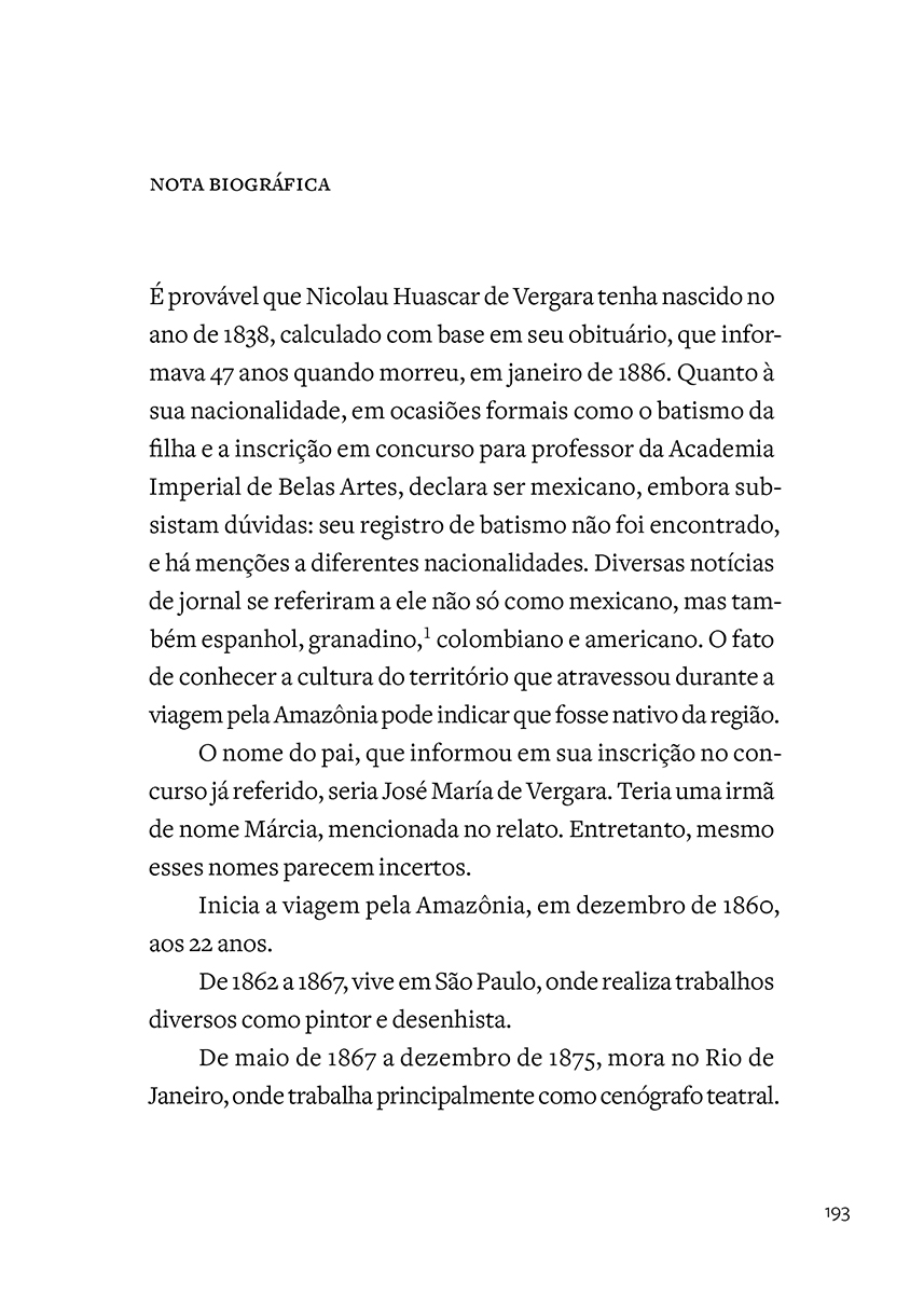 Desde os primeiros relatos de viagem pela Amazônia, a região encanta e seduz, com suas riquezas conhecidas, potenciais e também imaginadas. Ler o relato de Huascar de Vergara é uma viagem ao passado da floresta e traz a possibilidade de contar a história de um lugar que tem sido objeto de disputa internacional há séculos e que hoje, mais do que nunca, está no centro das discussões sobre a preservação da vida no planeta.